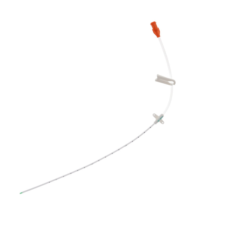 - un catéter de 15 cm de largo (códigos 1245.15/17/20 o de 20 cm (códigos 1248.15/17/20) con marcas centimétricas a partir de los 5 cm de la extremidad distal, con un pabellón con aletas que facilita la fijación del catéter y un prolongador integrado flexible y transparente en poliuretano (10 cm de largo) con clamp,